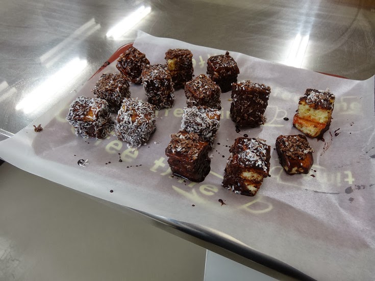 As for the lamingtons, well, they weren’t quite as successful. I never realised how tricky they were to make. A lamington, for the non-Australian, is a very light sponge cake covered in chocolate sauce and finally dipped in coconut. The process of dipping the lamingtons was extremely… ummmm… let’s say messy. I cleaned up afterwards and believe me there was a bit to clean up! And we ran short of coconut too. Plus there wasn’t a lot of sponge cake so they were half-sized lamingtons. And I realised that we should have cut the crust off the sponge as well. But, once inside the mouth, little of this mattered!
