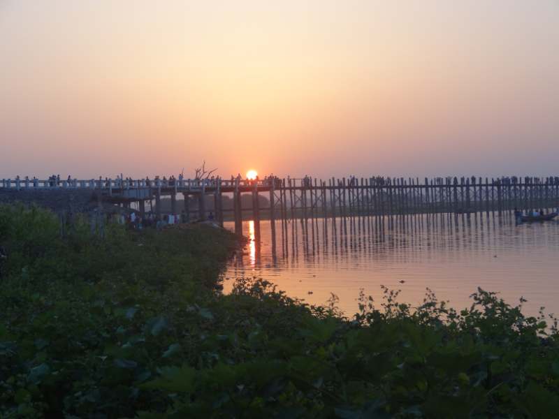 Yesterday I took a ‘Three Ancient Cities’ tour to Amapura, Sagaing and Inwa. It was a great day and we took in so many sites, temples and the like. These three towns are not far from Mandalay at all. We saw monks taking lunch, all lined up, more beautiful pagodas but the highlight was sunset on the U-bein bridge, a 1300 yard long teak bridge, the longest in the world. Yes, it was chock-full of tourists but was still a stunning place to be at sunset. The pollution from Mandalay makes most sunsets around here pretty awesome.