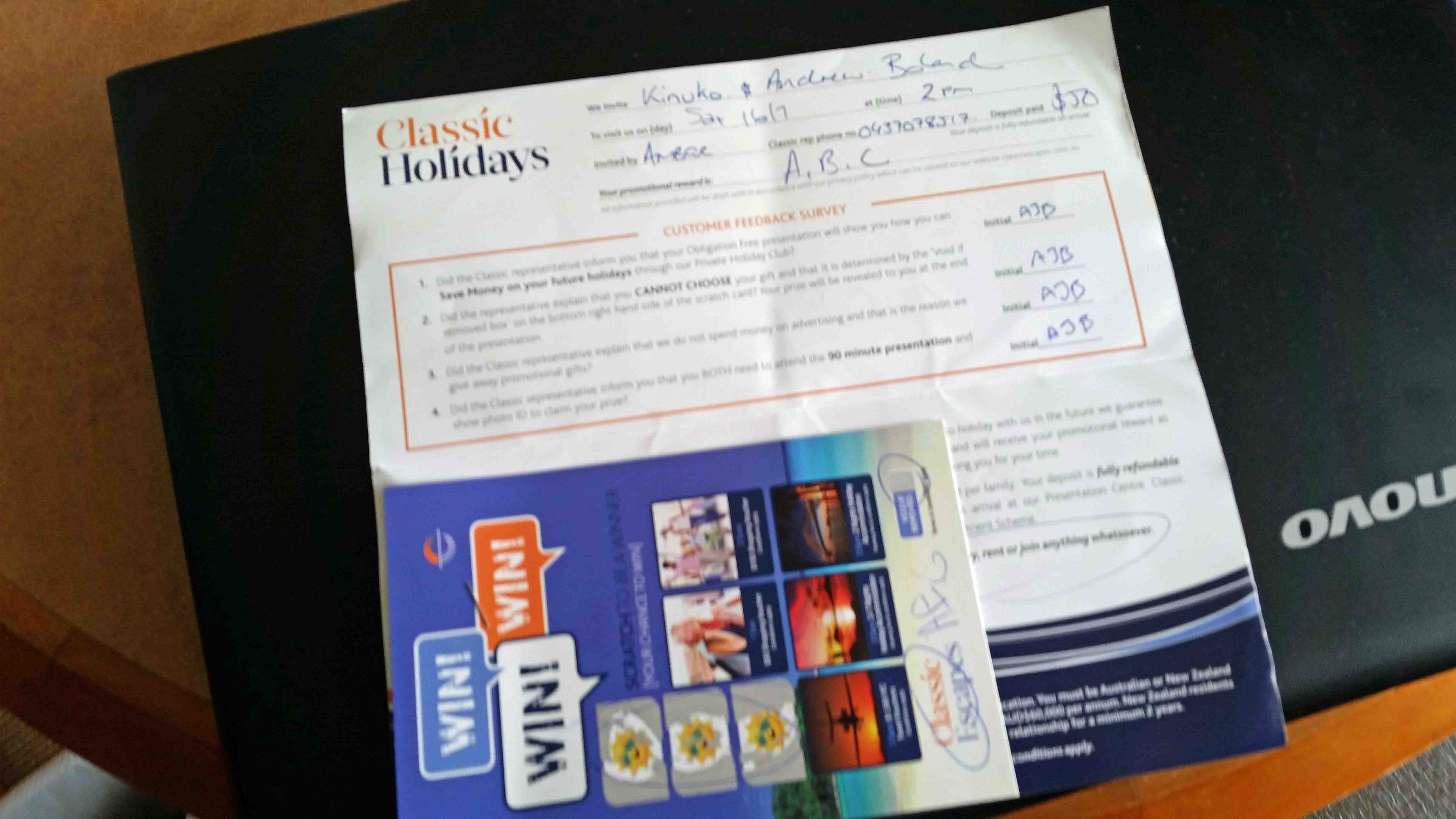 And there was more – seeming as how they were so nice to give us a prize, well, we needed to go to their office the next day and see a 2 hour presentation about the company. A naturally curious person, I thought from the get-go that this was all a little too good to be true, but yet wanted to see how it played out. After all, we hadn’t any firm plans the next day. 2pm then. Oh wait – we had to pay a deposit. That was to make sure we turned up I guess as we’d get it back the next day. So I’m not sure exactly what it was a deposit on. Now I was close to saying ‘no thanks’, but in the end we handed over fifty bucks and got a signed receipt.