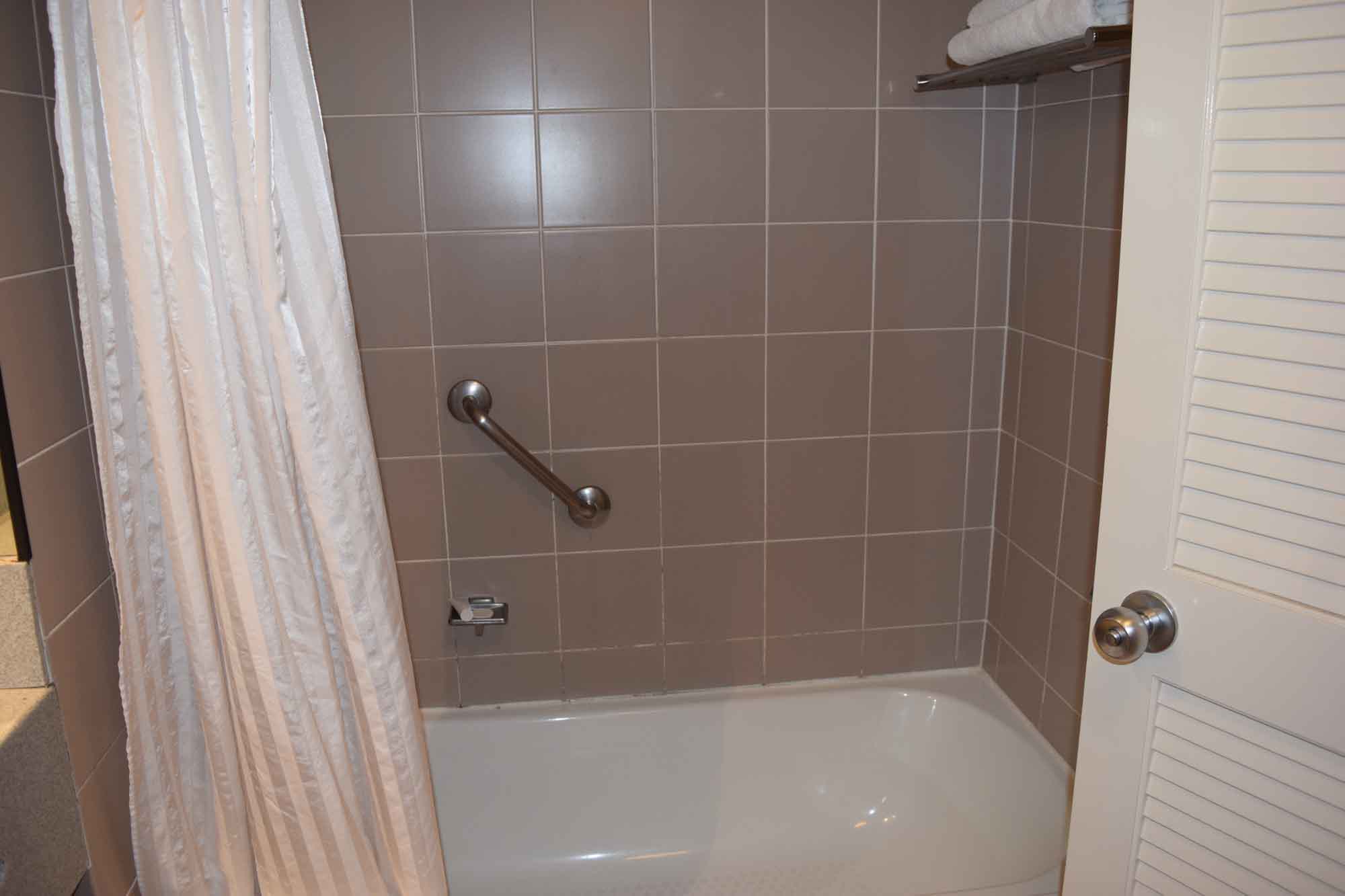 The bathroom is okay. Bath a bit small, but it’s clean if a little worn-looking. The toilet seat wouldn’t sit up which was annoying in a rush, and the shower head was too low, however the pressure and heat from it was awesome. The bathtub was not full size and I didn’t give a bath a go. They supplied shampoo, body lotion and conditioner as well as soap and towels, no face washer or shaving gear which was disappointing.
