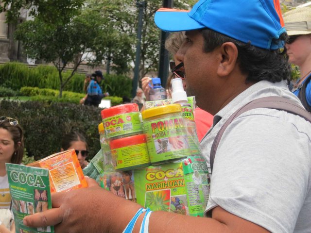 Selling coca leaves in central Quito.
