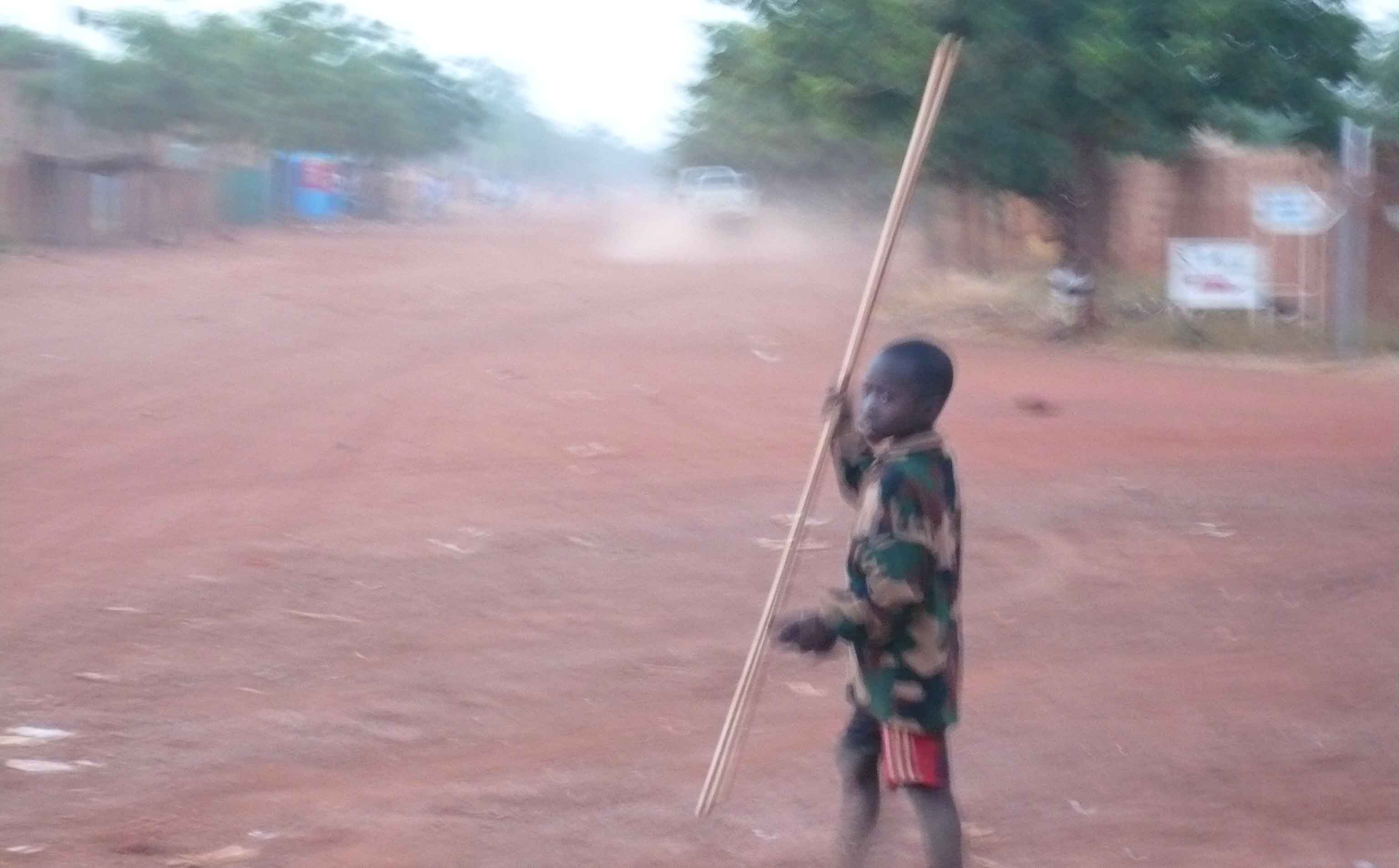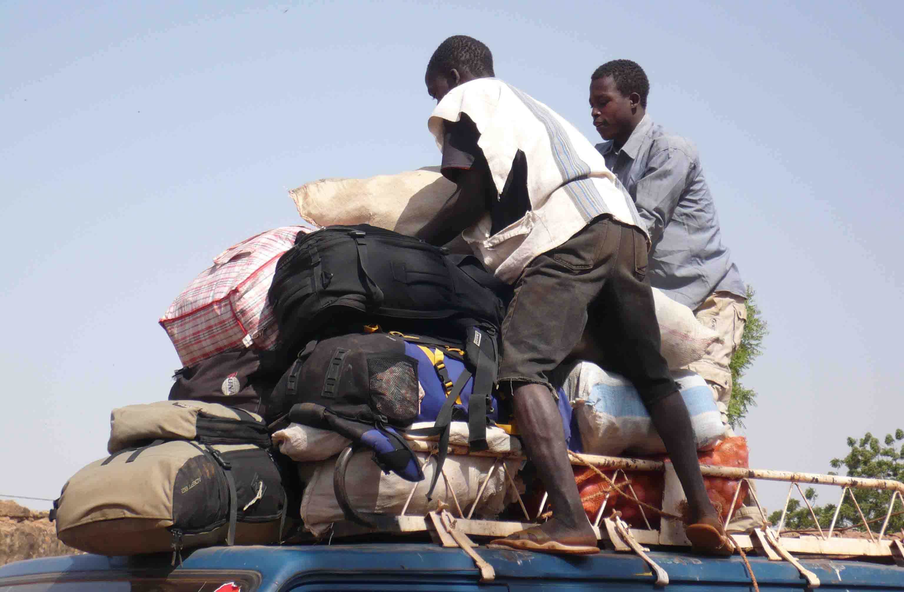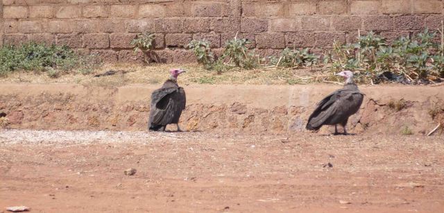 The next day, well, we had to go to the pickup area for transport, to move on to Mali. We waited beside the dusty road for an hour or so. There was a little activity, and vultures just sitting on the road. Finally the 4WD/minibus arrived and our bags were tied on the top.