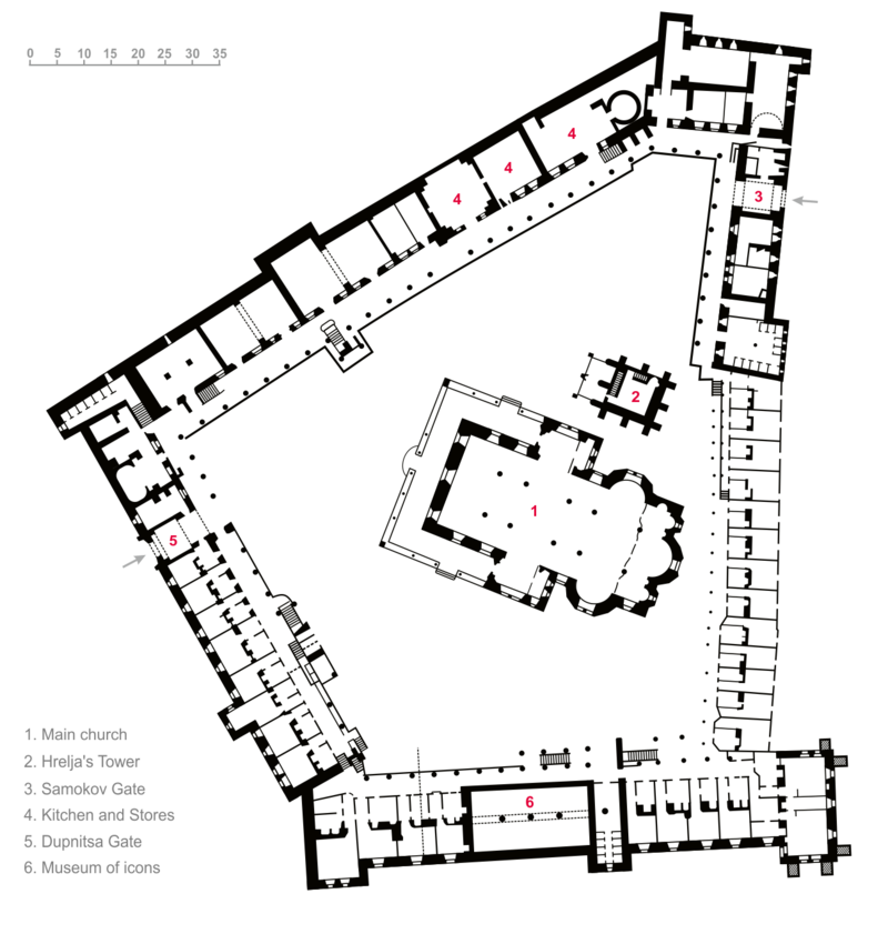 It’s a multi-storey affair with a large courtyard. You can explore the rooms, well some of them, mostly for monks’ lodgings. The shape of the thing is quite interesting – I found this little plan on Wikipedia which shows you – that although there are four strips of rooms, or buildings if you will, creating the courtyard in the middle, they are not in the least bit straight or predictable, which I rather like.