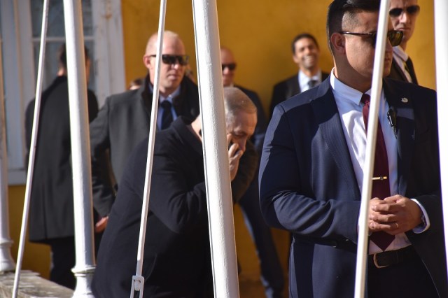 We took a shuttle to the palace entrance and everyone was stopped there. There was one important visitor and everyone had to wait for him. A cavalcade pulled up. Maybe eight ty o ten vehicles mostly black. Secret Service type guys with ear pieces and black suits, guns under jackets. From a Chrysler with a second back inside the back door came a guy with white hair. He was escorted to the palace. I asked the palace security he said he thought it was a Prime Minister. Of Israel, maybe.