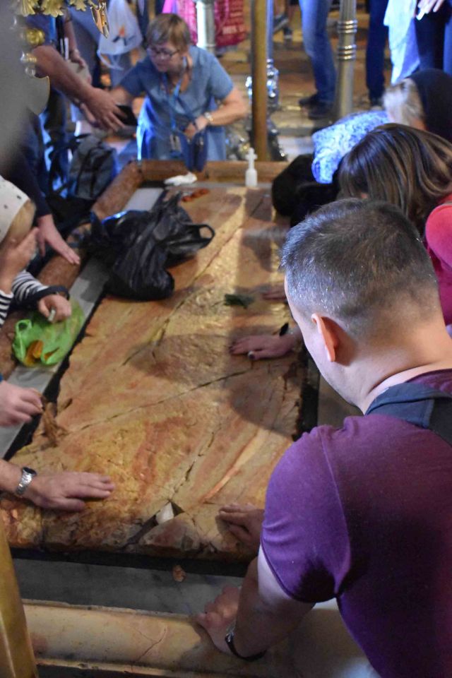 You climb stairs and there’s a chapel up there, featuring the Altar of the Crucifixion. And down near the entrance was a stone everyone was kissing – this was ‘Unicorn Stone’, which meant little to me. But it is (again purportedly) the stone on which Jesus was anointed before burial.
