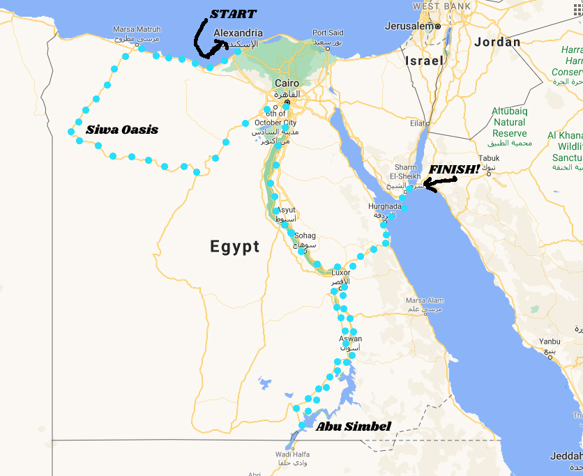 The last great crossing takes us by land to Hurghada, on the Red Sea coast, and then by ferry to the Sinai Peninsula, finally by road to Sharm El-Sheik. Go on to Dahab if you fancy it! Google says just over six hours, seems a little hopeful to me.