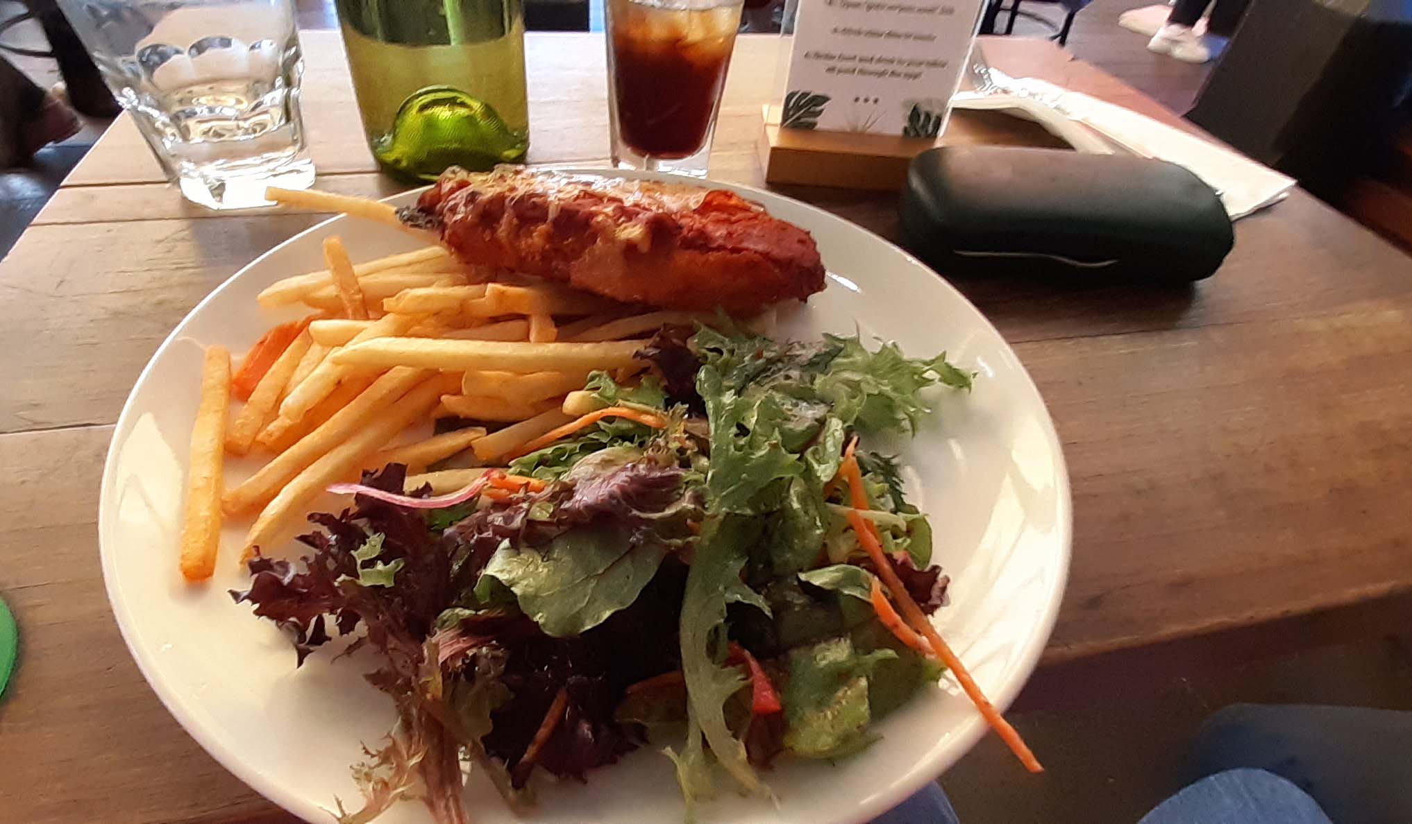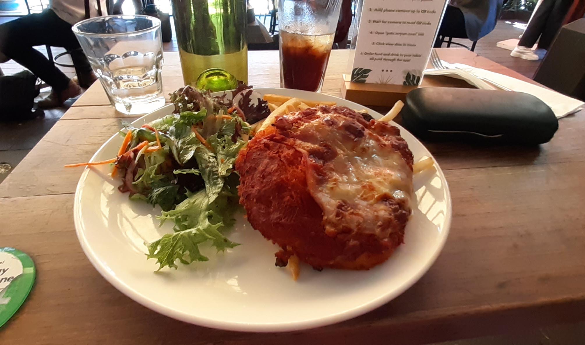 The wait time was fine, not too long. The parma came with shoe string fries and an okay salad. The sauce wasn’t very rich, it was a bit dried up all said, but it did come with the slice of ham. The chicken was thick and not too bad, but all in all it was disappointing. The staff too on the whole seemed really disinterested and not very responsive. I noted the way they interacted with the other customers and it was very minimal, not a lot of smiles. No-one likes to be hounded, I know, at a restaurant by staff but still.