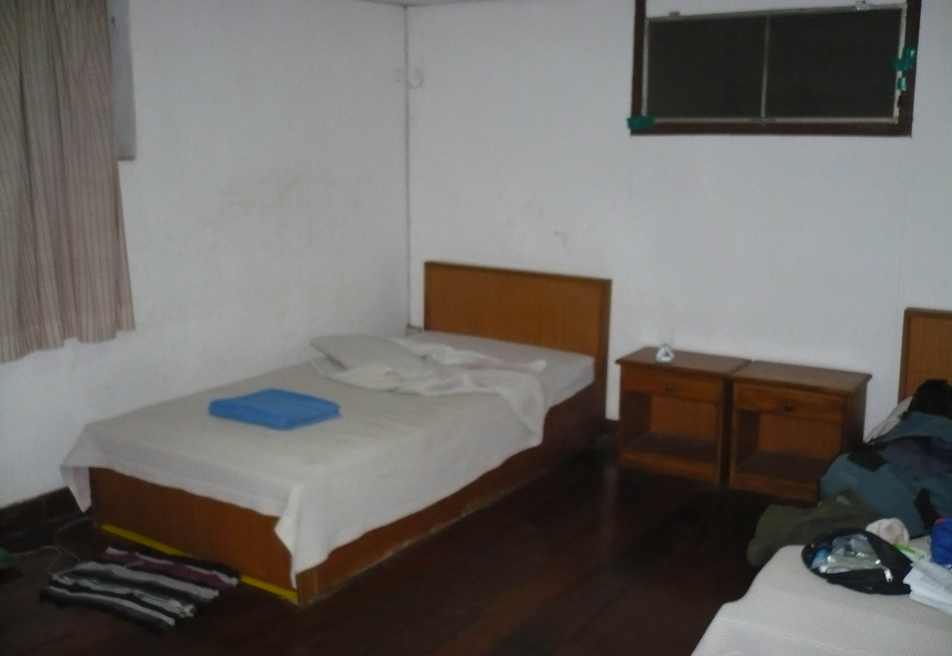 The room was dark. It was quite big, the facilities were shared and they were cleanish but pokey. I didn’t use their shower. It seemed quiet, the room was very brown. There were two single beds, the floor wasn’t quite flat, and there was only a floor fan. My notes say that it was quite dirty, I think the colour of the room – being brown – probably actually covered the true extent of it.