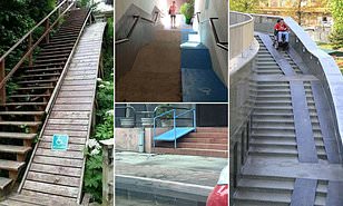 Well, they are for trolleys and wheelchairs. The thing is, are they the right width for starters? They are often (but not always) only around four centimetres wide. And they are the same incline as the stairs, which is actually really steep. So steep that you couldn’t control your chair on the way down and probably someone couldn’t push you on the way up. Motor wheelchairs I would think would be too heavy as well. To me it seems like a total failure in design.