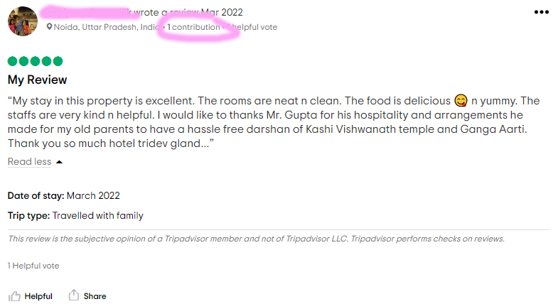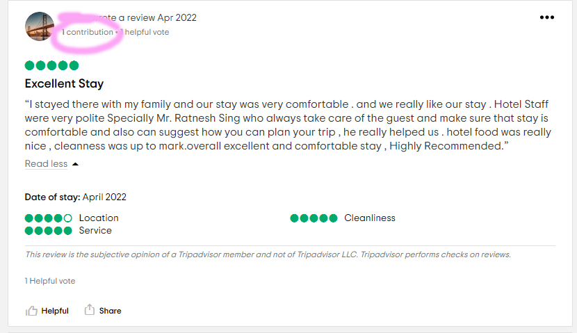 And so why? Why have fake reviews? And how is it done? I don’t know for sure, but my feeling is that management asks their friends and family to write reviews. People who have never written reviews before and so signs up for Trip Advisor and leaves a single review, hence it’s just a 1 review reviewer. Perhaps they are even told what to say. I don’t know (for sure).