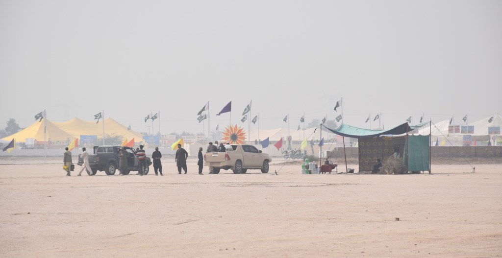 Once out of Ahmedpur East we saw the landscape, which was already pretty dry, turn into proper desert. And we would see the occasional vehicle headed to or from the rally. Not far from the town of Derawar, we hit the rally. Well, we turned off where you could see the activity of the rally. There was some sort of makeshift arena and we zoomed past it.