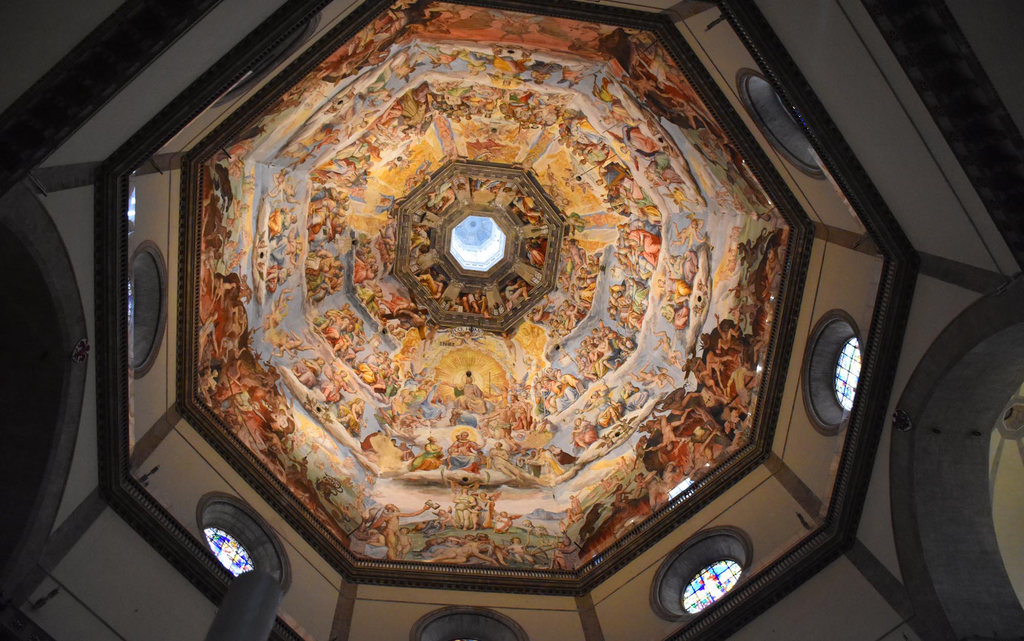 The Duomo di Firenze, or Florence Cathedral, or the Cathedral of Saint Maria di Fiore, (Maria of the Flowers) is the number one cathedral in town, and there are a few ways to visit. There is a ticket office in the square where you can purchase tickets to the tower, to the dome (I think), guided tour or more, it’s a bit costly and can sell out days in advance depending on the ticket. Nothing that appealed to me was available the day I went (and I didn’t know about booking in advance) so I just went for what a lot of tourists do and waited outside the front door in a queue for a while – 20 minutes at a guess – and saw the cathedral including the dome from below for free.