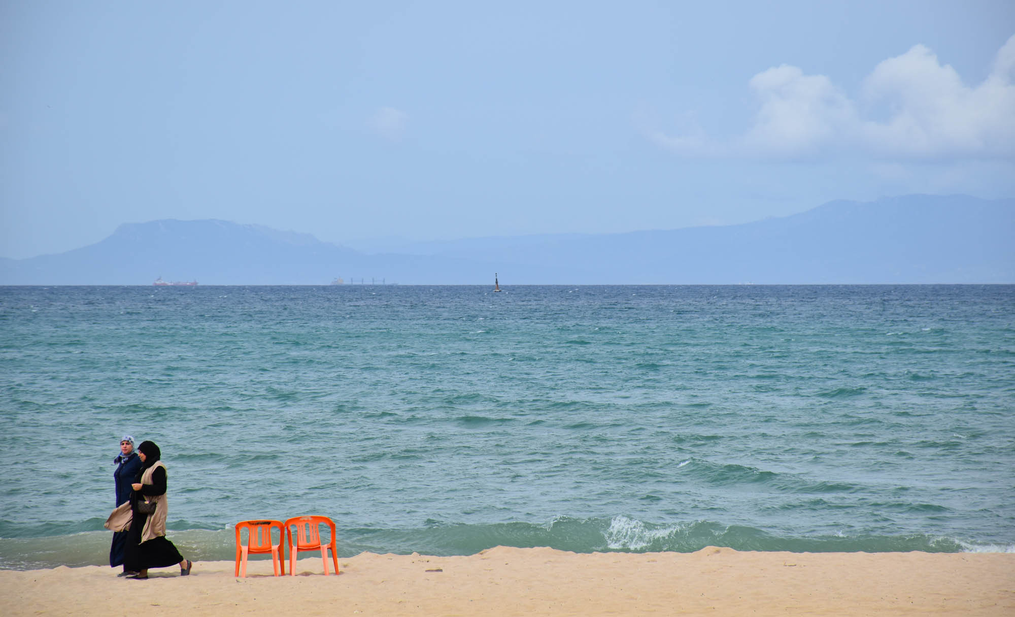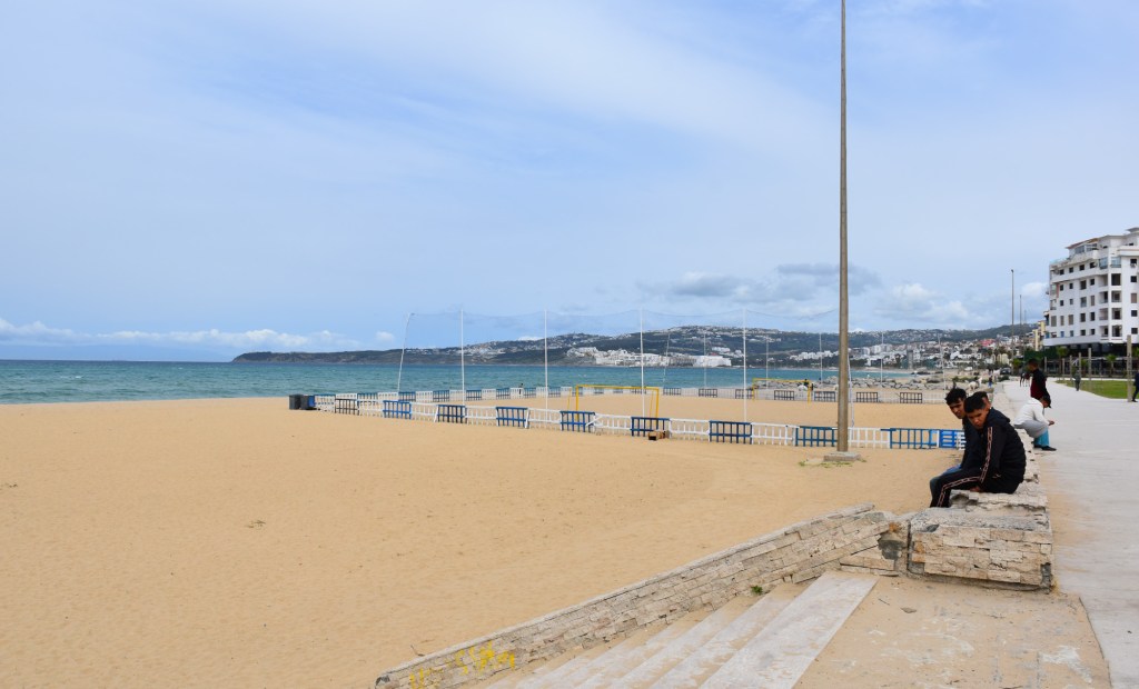 After that – well actually we passed a barber on the walk to the beach and it was time for a quick cut if the hair, and then we walked onto the beach. The beach is really nice, if mostly deserted with the warmer weather yet to start. There was a wide stretch of sand, volleyball courts (sand), a great view too with the city behind you and the hills and cliffs stretching each way and then, not so far away in the distance, the cliffs of Spain. Or hills. Whatever they were they were Spanish and visible!