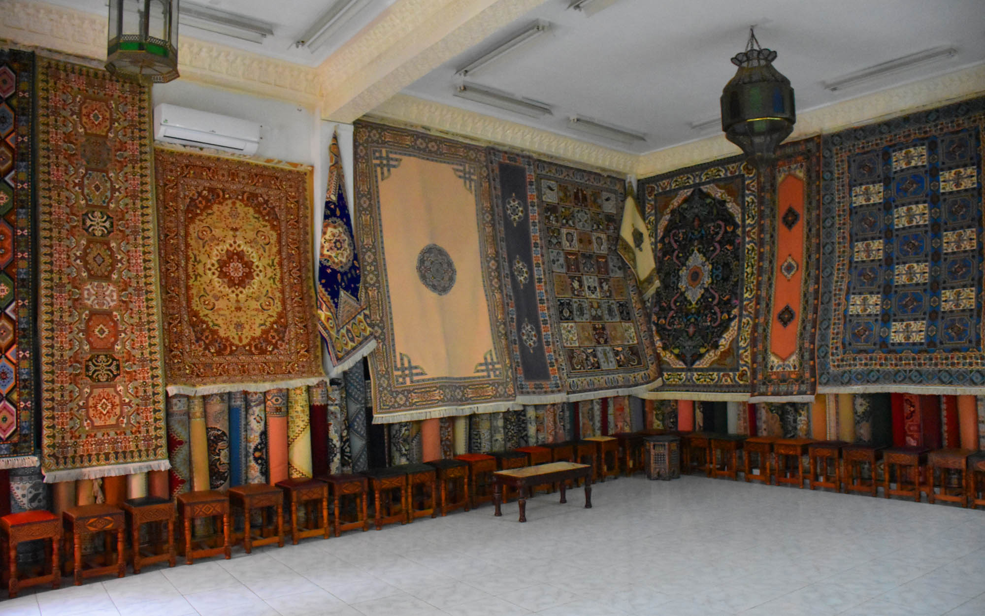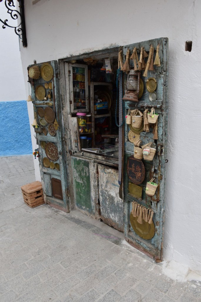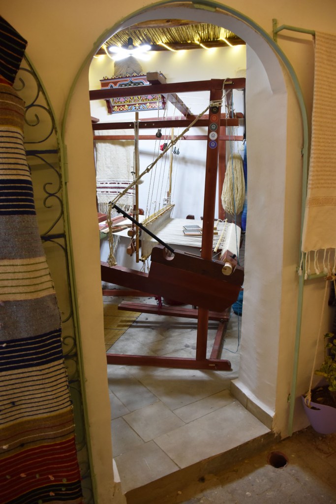 We also came to the Bab El Bahr – the Gate of the Sea which we walked through and gave us an impressive view below of the coast and the cliffs and of course the ocean and parts of Tangier. Wandering the Casbah we discovered lots of little squares too as well as a section where there were a lumber of looms on display. No-one around them at the time, in little rooms off a covered street. There were also a few cafes but not open as it was Ramadan.