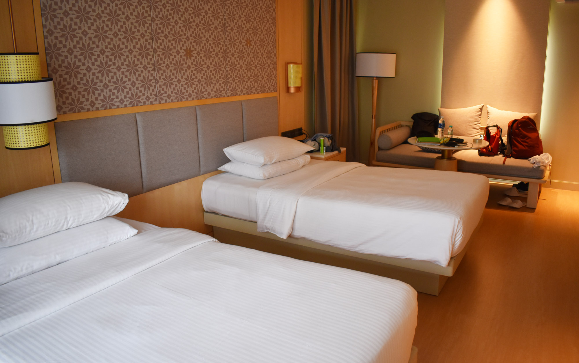 The room was very comfortable and well air conditioned. It was humid but not super hot at all whilst we were there, and with a little deck outside we had a couple of seats to sit in and relax. The room was extra spacious, two big comfy queen-sized beds, various lights too as the mood takes you, a TV, table and chairs. Really nice room.