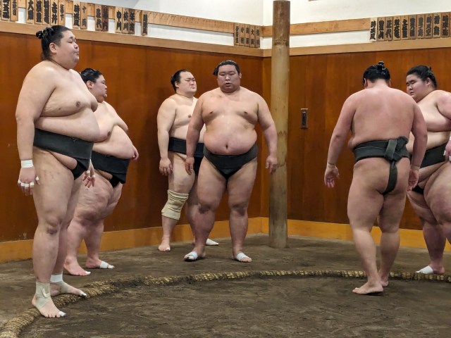 You get off at the JR Ryogoku Station (EAST Exit) to find your guide. Attached to the station is a building which houses a full size Sumo ring which was also part of the tour. It’s also pretty much next to the Ryogoku Kokugikan National Stadium where the professional tournaments are staged in Tokyo and I think at the right time of the year you can get a glimpse inside of that with the tour, but there was some sort of conference going on at the time so we could only see from outside.